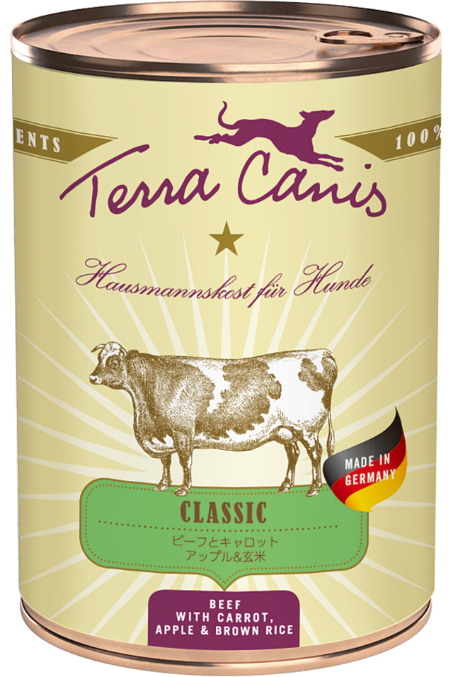 テラカニス クラシックシリーズは穀物や疑似穀物類にアレルギーを持たない最もベーシックなレシピで、全ての成犬と標準体重の犬に適しています。 毎日続けて食べられる「コンプリートフード」 穀物(玄米)は非常に少なく平均約6.6%の配合。グルテンフリーレシピです。第一原材料に心臓、その他筋肉やレバー・肺・野菜・果物・ハーブなど20種類以上の素材を使用しています。FEDIAF(欧州ペットフード工業会連合)の栄養基準をクリアしたコンプリートフードです。総合栄養食と同じく、毎日食べ続けても健康を維持できます。いつものごはんにトッピングしたり、手作り食素材のひとつとしてもご使用いただけます。 【おいしさの秘密】 ドイツ バイエルンの伝統的なお肉屋さんが作ったホームメイドスタイルのデリカテッセ、テラカニス。「愛するパートナー(愛 犬)のために高品質な食材、手作りのやさしさ、おいしさを手軽にご家庭で」をコンセプトに作られています。 ⚫︎ヒューマンクオリティ テラカニスシリーズに使われる食材は「人が食べられる品質」ではなく「人が食べる品質」であることを重要視しており、人用の食材をその場で調理しています。ヒューマングレードよりもさらに高品質なヒューマンクオリティにこだわっています。 ⚫︎食材の栄養がしっかり吸収できる 野菜や果物の栄養素の吸収率をより高めるため、それぞれの食材を、裁断・調理・裏ごししています。 ⚫︎缶にもこだわり。おいしさ維持 テラカニスシリーズに使われている缶は、おいしさを保つため内側にもコーティングが施されています。開封後3日間は缶のまま冷蔵庫で保存することができます。3日以上保存する場合は、製氷皿などに小分けにし冷凍保存で3週間保存可能です。 【与え方の目安】1日あたりの給与量目安 成犬体重、給与量の順に記載 5kg 200 - 300g 10kg 400 - 500g 20kg 700 - 900g 30kg 1000 -1300g 犬種・年齢・活動量に応じて給与量が異なる場合があります。 パートナ(愛 犬)の体重増減状態に応じて給与量を調節してください。 【ご使用上の注意】 ◆全てヒューマングレードの原料を使用し、合成添加物は一切使用していません。 ◆こちらの商品は「コンプリートレシピ」として欧州ペットフード工業会連合(FEDIAF)の定める栄養ガイドラインに沿って製造しています。成犬以上のパートナー(愛 犬)であれば本品のみで与えていただけます。 ◆直射日光を避け、涼しく乾燥した場所で保存してください。 ◆缶の内側のコーティングは100%食品耐性であり、そのままラップで包み冷蔵庫に保管する事ができます。 ◆開封後は3日以内にご使用ください。(3週間程度は冷凍保存も可能ですが、商品の風味が落ちます。ご了承ください) ◆まれに缶の蓋外側にわずかに汚れが残っている場合がございますが、中身の品質に問題はございません。製造過程で洗浄する際にわずかに付着物が残り、そのまま加熱した場合に発生するとのことです。何とぞご了承ください。 【内容量】 400g 【原材料】 牛の心臓(30%)、ズッキーニ、にんじん(12%)、牛の肺(11%)、リンゴ(9%)、牛のレバー(7%)、玄米(6%)、牛の筋肉(4.5%)、アプリコット、亜麻仁油、オイスターシェル*、ビール酵母*、バジル*、フェンネルの種*、パセリ*、ミネラルクレイ*、ローズヒップ、海藻*、ビタミンD3、ビタミンE、銅、ヨウ素、亜鉛 【成分表】 租タンパク質/8.80% 租脂肪/6.90% 租繊維/0.70% 租灰分/1.20% 水分/75.60% 代謝エネルギー100g/Kcal/112.3 【原産国】 ドイツ